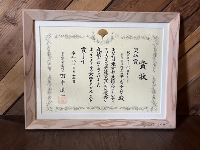 上馬5丁目プロジェクトが「ウッドシティTOKYOモデル建築賞」の「奨励賞」を受賞しました。同賞は、東京における国産材需要を喚起することで、多摩地域および全国の森林循環を促進すると同時に、林業・木材産業の成長を図ることを目指し、木材利用の新たな可能性を提案するモデルとなる建築物を表彰するものです。今回で第7回目となります。表彰状の額縁も多摩産材で作られていました。受賞作品集は下記プレスからご覧ください。