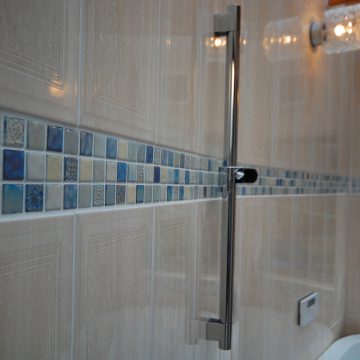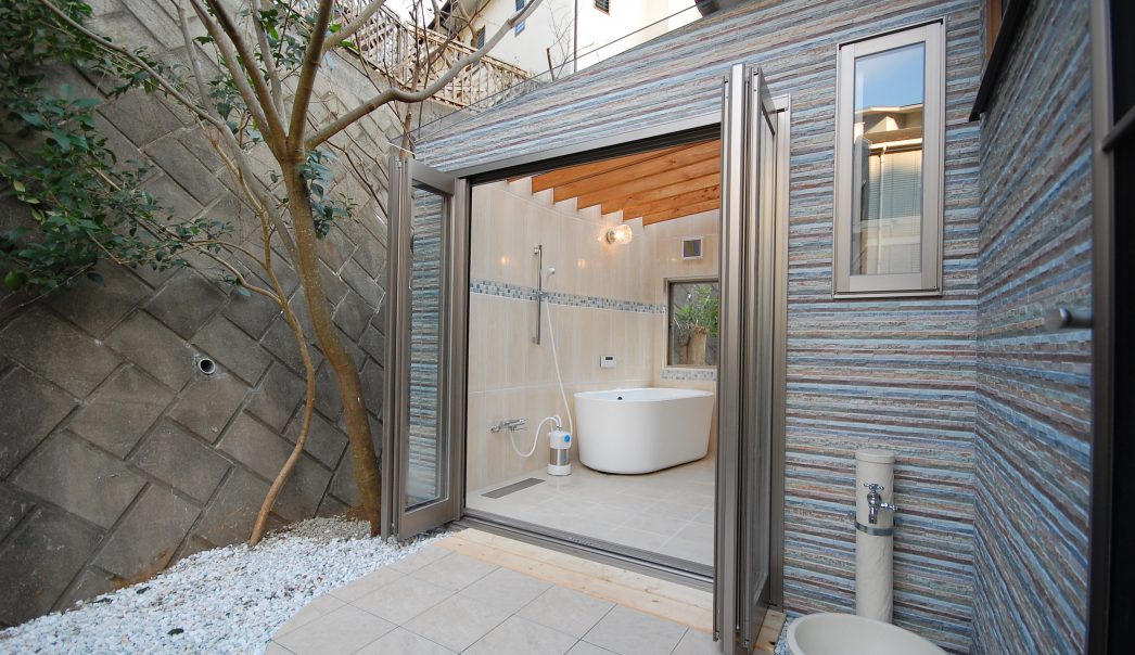 神奈川県藤沢市で戸建て住宅のリフォームを承りました。 キッチンのカウンターは、フローリング材をヘリンボーン貼りで仕上げています。お庭からもアプローチ出来る開放的なお風呂が特徴です!